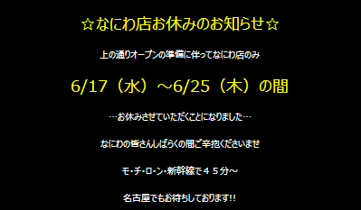 マジスパがっ 2009.06.22この記事は約1分で読めます。土曜日、晩飯食べにマジスパ行ったら、休みだった。名古屋店オープンの為に25日まで休みなんだとか。 後で、車の中からマジスパホームページ見たら、書いてるっw 教訓:出かける時は、下調べを必ずしましょう;w;